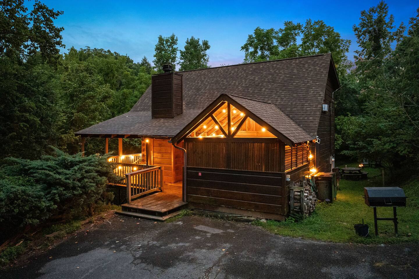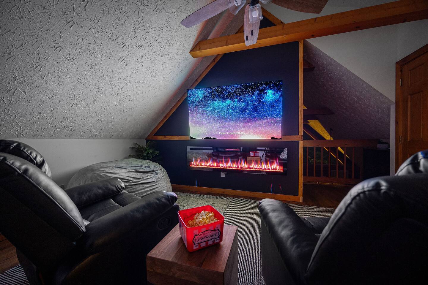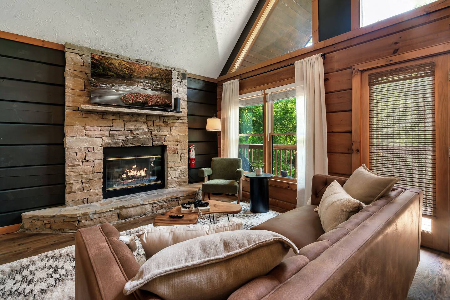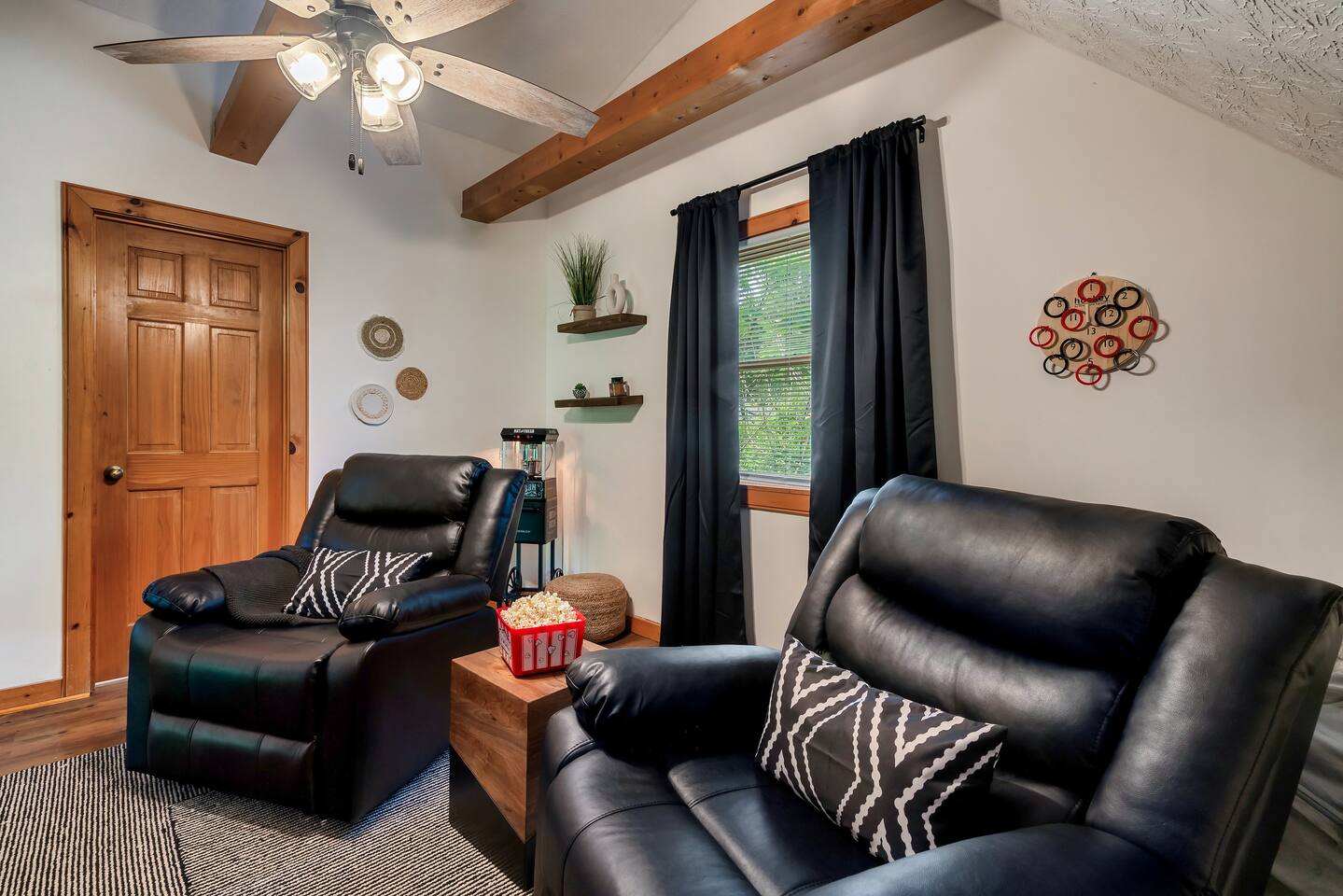 * Secluded, cozy space for couples * Dogs are welcome! * Luxury cabin for getting away from it all, but still only 5 minutes from the Parkway in Pigeon Forge. * Amazing theater room with popcorn machine, popcorn provided * 3 smart tvs to stream all your shows * Hammock, hot tub, outdoor grill, solo stove * Wood burning fireplace in the living room, and electric fireplace in theater room for cozy ambiance. * Resort has seasonal outdoor pool and a peaceful nature trail for hiking