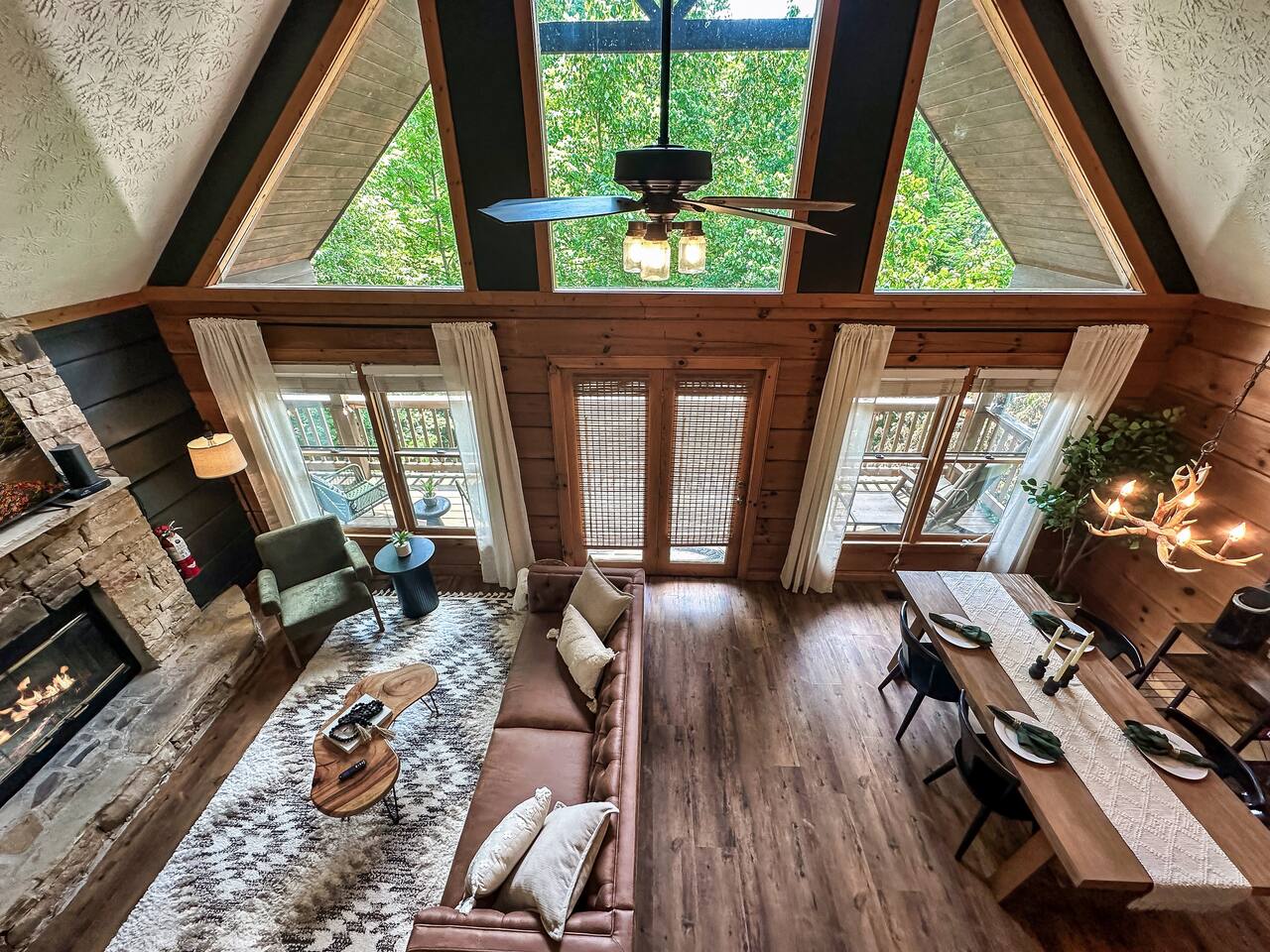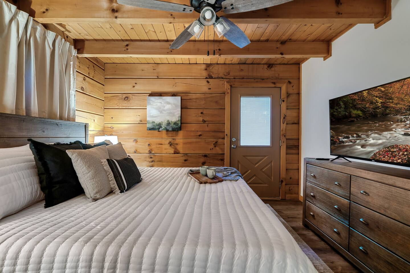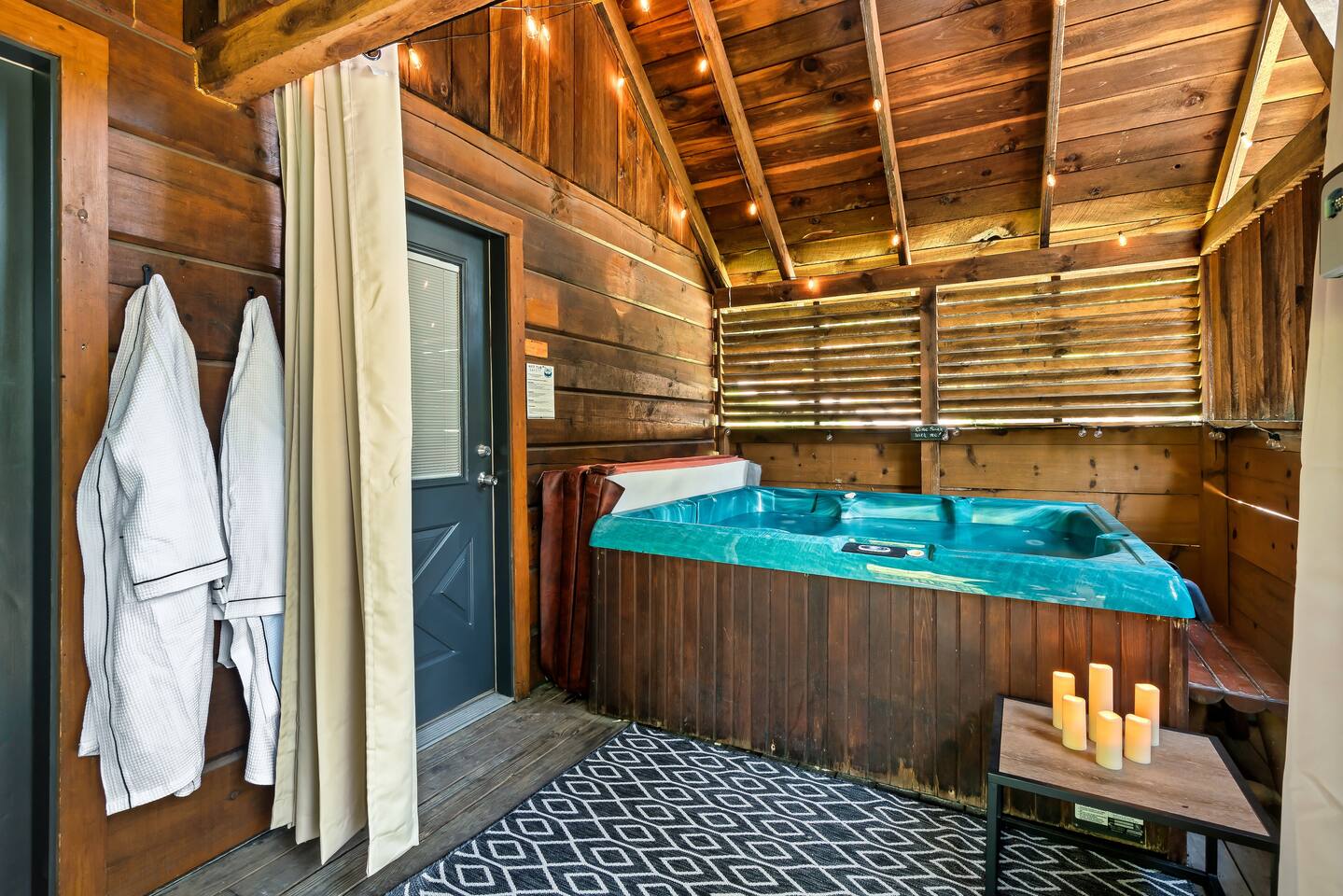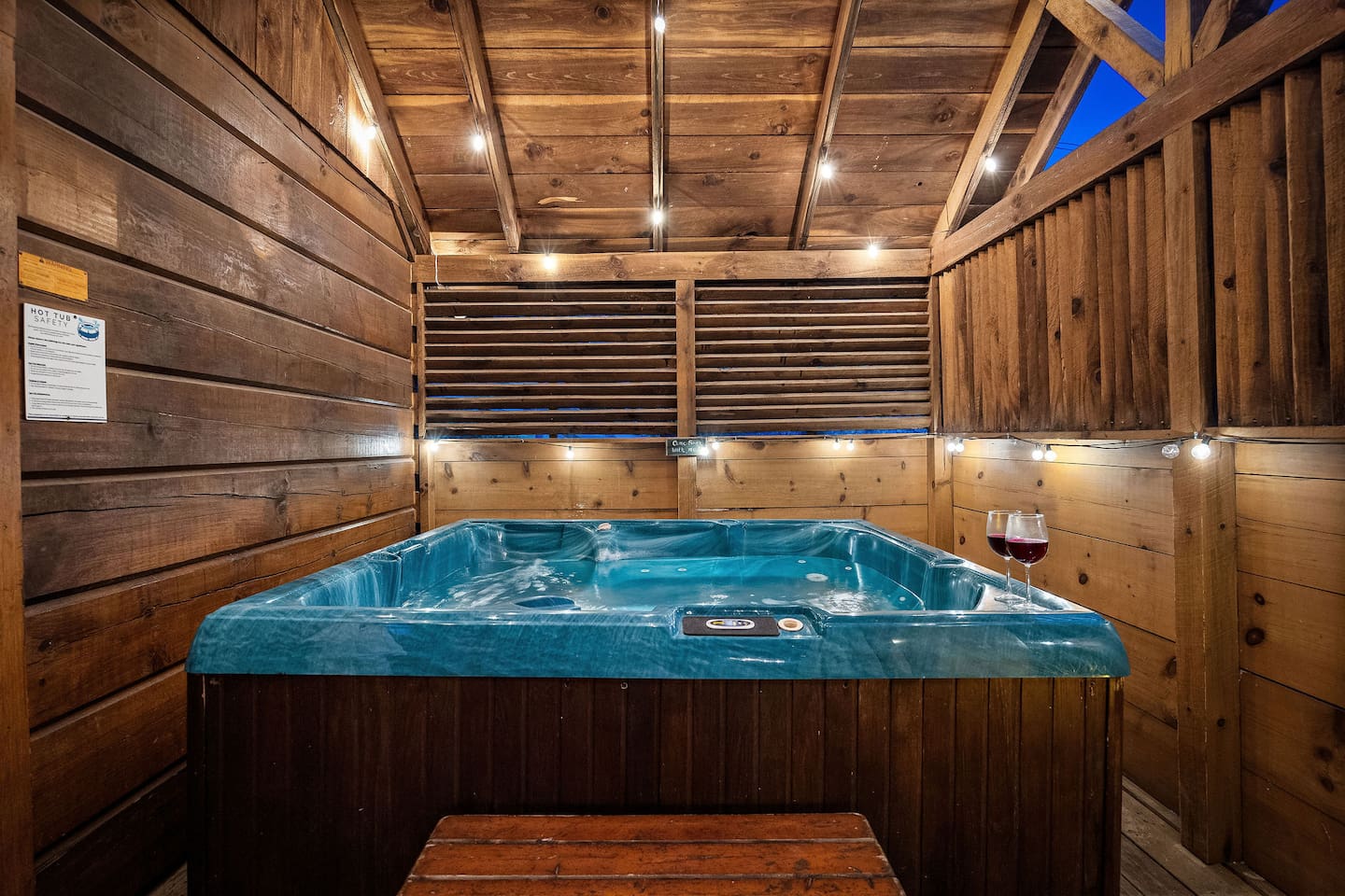 Welcome Couples!!! ✅ secluded cabin but close to everything, no steep roads ✅ HUGE private, romantic hot tub area with lux robes ✅ cozy wood burning Fireplace ✅ theater room with 75” smart TV, electric fireplace, games, and popcorn machine ✅ lux king size bed ✅ hammock for kicking back on the deck ✅ fully equipped for dog parents to bring their babies ✅ door dash & instacart deliver to cabin ✅ coffee/ hot chocolate/ tea bar with all fixins ✅ resort has hiking trail & outdoor seasonal pool available for you use ✅ romance packages available for additional fee and 24 hour notice. We are able to sleep a maximum of 4 guests. There is a private bedroom with a king bed. The second sleeping area is the upstairs loft. It has a CordaRoy brand beanbag chair that folds out into a queen size sleeping mattress. It should be noted that this mattress is on the floor, so would be best suited to those with no physical limitations. Our cabin is private but close to everything. There are no steep roads to get to the cabin. Parking enough for 2 cars. The cozy, modern living room invites you to snuggle up on the leather couch in front of the crackling fire and watch a movie. In case you decide to stay in for the night and cook, we have a well appointed kitchen with everything you would need. There are 2 newly updated full bathrooms that provide plenty of towels, soap, shampoo, and conditioner you need during your stay. "The stay was absolutely amazing and private! Stacey was well with emails and communication! The place was clean and had everything we needed for our stay! Will be booking from her again! Thanks for the nice Tennessee hospitality." The lux master bedroom has a king bed with comfy linens. We always have plenty of extra pillows and blankets should you need them. From the master bedroom you can head directly out to the romantic hot tub area. We have twinkle lights and battery powered candles to provide atmosphere. "We had a wonderful stay here! The cabin was beautiful and the amenities were all top notch. We loved that the cabin itself was in a peaceful setting in the woods but we were only a very short drive to restaurants and attractions. The neighborhood pool was a lovely little bonus. Highly recommend and would definitely return!" The deck has a beautiful valley view that can be observed while kicking back in the deck chairs or the hammock. There’s a park style grill close to the entrance of the cabin. You bring the charcoal. "Stacey was amazing and the cabin was even better! There’s a yard in the back with greenery all around, perfect for letting the dogs chase a ball around. Very private and comfortable and only minutes from everything in Pigeon Forge. The bed is so comfortable and the pillows were perfect. I woke up rested and ready for activities. Stacey provided a dog kennel under the stairs big enough for both Boston terriers to fit comfortably. The deck out back is incredible in the morning sunlight and the jacuzzi was crystal clear. 10/10 would absolutely be back if available for our next trip!"