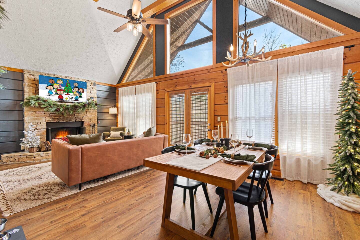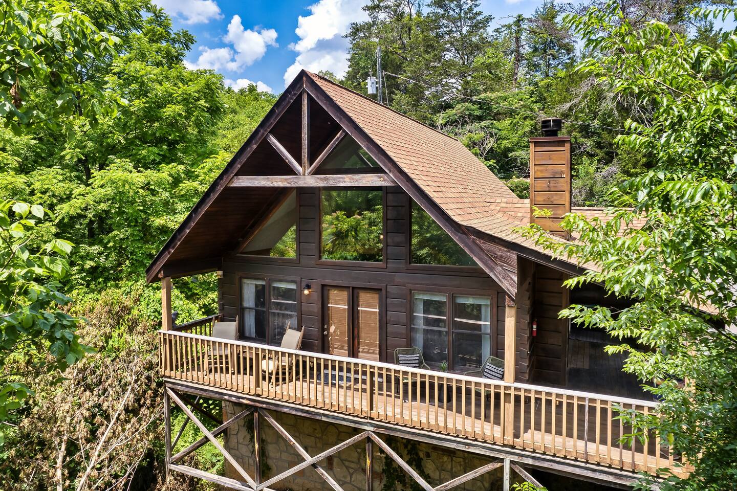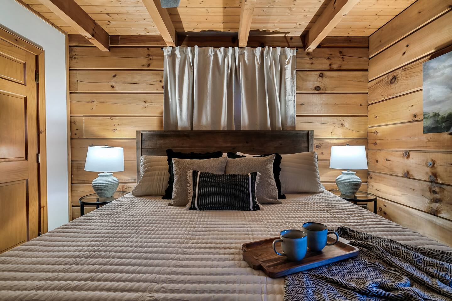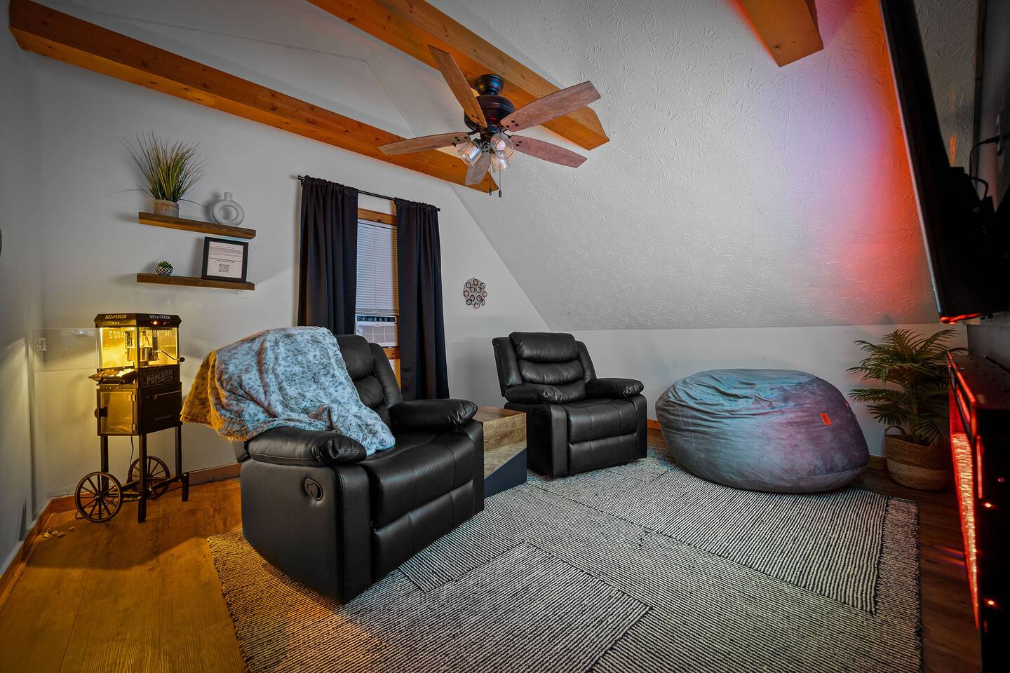 Welcome Couples!!! ✅ secluded cabin but close to everything, no steep roads ✅ HUGE private, romantic hot tub area with lux robes ✅ cozy wood burning Fireplace ✅ theater room with 75” smart TV, electric fireplace, games, and popcorn machine ✅ lux king size bed ✅ hammock for kicking back on the deck ✅ fully equipped for dog parents to bring their babies ✅ door dash & instacart deliver to cabin ✅ coffee/ hot chocolate/ tea bar with all fixins ✅ resort has hiking trail & outdoor seasonal pool available for you use ✅ romance packages available for additional fee and 24 hour notice. We are able to sleep a maximum of 4 guests. There is a private bedroom with a king bed. The second sleeping area is the upstairs loft. It has a CordaRoy brand beanbag chair that folds out into a queen size sleeping mattress. It should be noted that this mattress is on the floor, so would be best suited to those with no physical limitations. Our cabin is private but close to everything. There are no steep roads to get to the cabin. Parking enough for 2 cars. The cozy, modern living room invites you to snuggle up on the leather couch in front of the crackling fire and watch a movie. In case you decide to stay in for the night and cook, we have a well appointed kitchen with everything you would need. There are 2 newly updated full bathrooms that provide plenty of towels, soap, shampoo, and conditioner you need during your stay. "The stay was absolutely amazing and private! Stacey was well with emails and communication! The place was clean and had everything we needed for our stay! Will be booking from her again! Thanks for the nice Tennessee hospitality." The lux master bedroom has a king bed with comfy linens. We always have plenty of extra pillows and blankets should you need them. From the master bedroom you can head directly out to the romantic hot tub area. We have twinkle lights and battery powered candles to provide atmosphere. "We had a wonderful stay here! The cabin was beautiful and the amenities were all top notch. We loved that the cabin itself was in a peaceful setting in the woods but we were only a very short drive to restaurants and attractions. The neighborhood pool was a lovely little bonus. Highly recommend and would definitely return!" The deck has a beautiful valley view that can be observed while kicking back in the deck chairs or the hammock. There’s a park style grill close to the entrance of the cabin. You bring the charcoal. "Stacey was amazing and the cabin was even better! There’s a yard in the back with greenery all around, perfect for letting the dogs chase a ball around. Very private and comfortable and only minutes from everything in Pigeon Forge. The bed is so comfortable and the pillows were perfect. I woke up rested and ready for activities. Stacey provided a dog kennel under the stairs big enough for both Boston terriers to fit comfortably. The deck out back is incredible in the morning sunlight and the jacuzzi was crystal clear. 10/10 would absolutely be back if available for our next trip!"